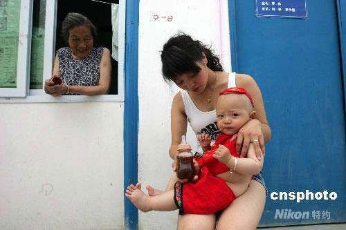 都江堰災(zāi)民安置點簡易房前的祖孫三代