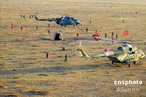 圖:搜救隊員到達神七返回艙著陸現(xiàn)場