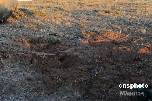 圖:神七返回艙底部反推點火在地面形成的四個坑