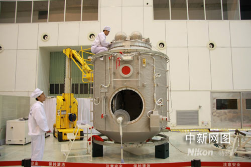 圖:劉伯明在飛船軌道艙檢查并組裝艙外航天服