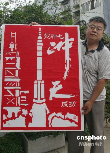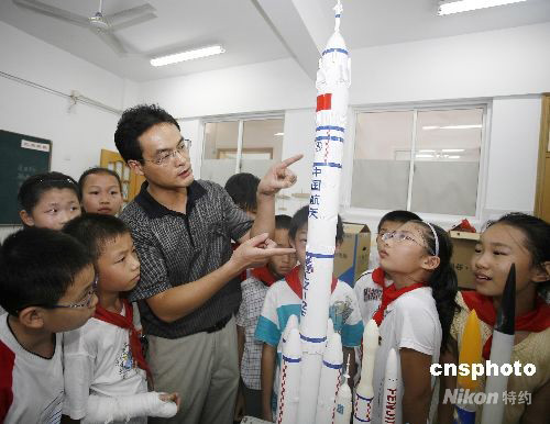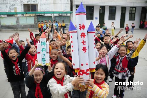 圖:常萬全家鄉(xiāng)小學(xué)生祝“神舟七號”發(fā)射成功