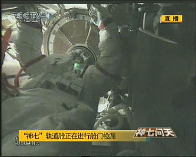 圖:翟志剛在軌道艙確認艙門檢漏情況
