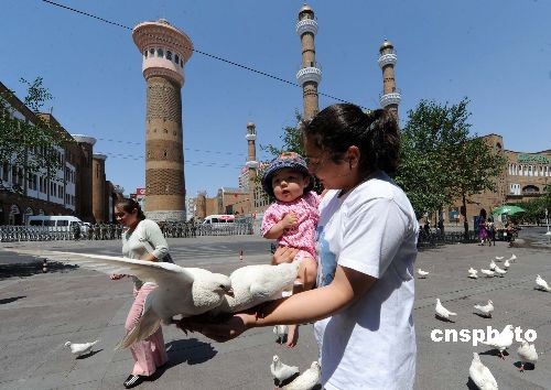 圖:烏魯木齊市民在大巴扎喂食廣場鴿(2)