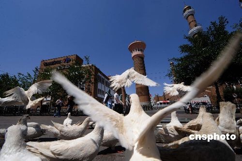 圖:烏魯木齊市民在大巴扎喂食廣場鴿