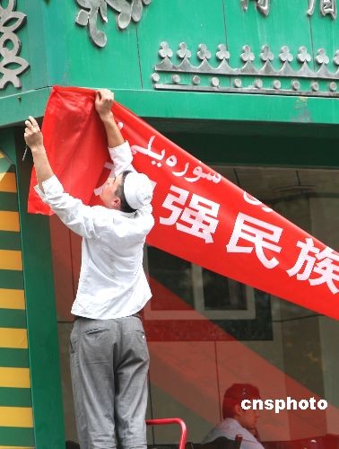 圖:烏魯木齊市一店主懸掛“民族團結”橫幅
