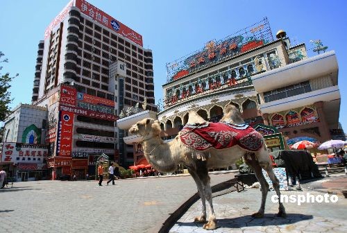 圖:駱駝在烏魯木齊街頭供游客拍照