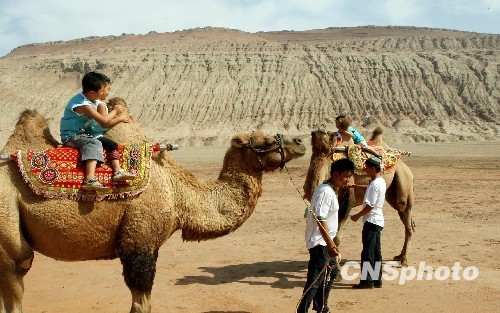 圖:小游客騎駱駝游覽新疆吐魯番火焰山