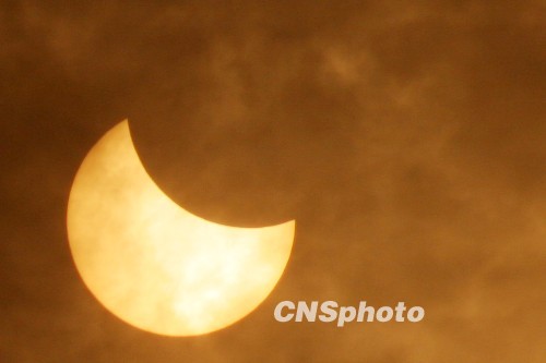 中國各地觀測(cè)日食奇觀:江蘇贛榆透過薄云看日食