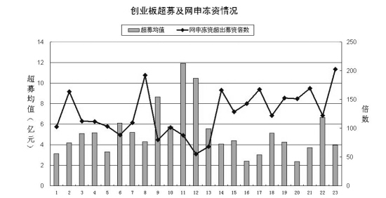 若按創(chuàng)業(yè)板上市公司計劃的募集資金,則板塊的初始規(guī)模也將小得多。統(tǒng)計顯示,前23批創(chuàng)業(yè)板股首發(fā)預計募資總額為276.82億元,而首發(fā)募資總額卻比其超出577.80億元,超募比例高達2.09倍,平均每家公司超募4.82億元。事實上,板塊超募比例在1倍以上的個股多達103只,占總數(shù)的86%,可見對創(chuàng)業(yè)板而言,超募就是一種常態(tài)。