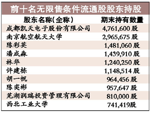 而從三季報看出,在成飛集成大漲的同時,不少投資者斥巨資進入。在十大股東中,除了成都凱天電子、南京航空航天大學,以及西北工業(yè)大學外,新進入了7大股東,累計增持的804.2萬股,其中陳彩英、潘成淼、林華等5人為自然人持股,蕪湖潤瑞投資也以81萬股,成為第九大股東。沈文軍、張雪娟等已經(jīng)被踢出前十大流通股東。有市場分析師認為,無論這5位自然人是什么來頭,都不愧為今年的最牛散戶。(張忠安)