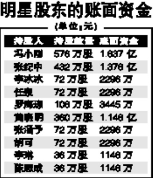 據(jù)了解,華誼最早的原始股價是0.53元,李冰冰、任泉等一批最早的股東就是以該價格買進的?偟膩碚f,明星股東持股價最低平均每股不到1元,黃曉明等加入較晚,平均每股購入價為3元已經(jīng)算是最高。而各類明星的購買數(shù)量則是以“萬”為單位計算,如李冰冰、任泉起初就購進36萬股,而馮小剛則用151.48萬元購得288萬股。而在今年年初,華誼兄弟還公布了一套分紅方案:每10股轉(zhuǎn)增10股并派現(xiàn)3元(含稅)。于是公司明星股東手中持有的股票全部翻倍,“一哥”黃曉明持股數(shù)由180萬股變成360萬股,他在紅利方面還有54萬元進賬!耙唤恪崩畋止蓴(shù)則由36萬股增加至72萬股,現(xiàn)金紅利10.8萬元。馮小剛的持股數(shù)更是翻到了576萬股,另外還拿到86.4萬元的現(xiàn)金紅利。
