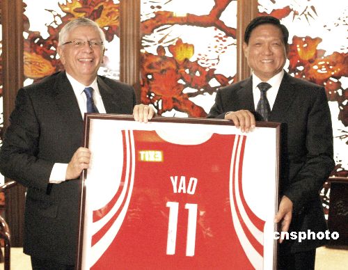 正在紐約出席聯(lián)合國大會的中共中央政治局委員、北京市委書記、北京奧組委主席劉淇,十一月一日會見美國職業(yè)籃球協(xié)會(NBA)總裁大衛(wèi)·斯特恩,斯特恩向劉淇贈送了姚明在NBA火箭隊(duì)的十一號球衣。中新社發(fā) 李靜 攝
