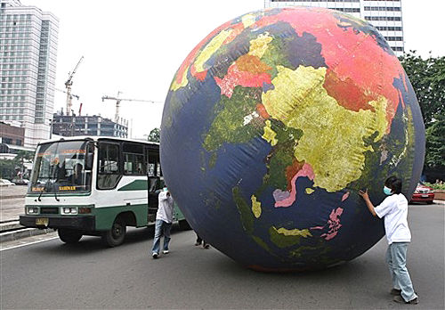 11月16日,印尼的環(huán)保主義者在首都雅加達(dá)推動一個(gè)巨大的充氣地球模型,參加此次“清潔空氣,控制溫度”活動。印尼是全球重要的溫室氣體排放國。今年12月印尼巴厘島將迎來聯(lián)合國氣候變化大會。