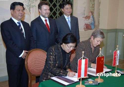 11月30日,維也納中國文化中心項(xiàng)目的簽字儀式在維也納市政廳舉行。中國文聯(lián)書記胡振民(后排左一)、中國駐奧地利大使吳懇(后排右一)出席簽字儀式。圖為奧中文化交流促進(jìn)會(huì)會(huì)長(zhǎng)金鈴和維也納市政府代表(前右)在合作協(xié)議書上簽字。中新社發(fā) 鐘誠 攝