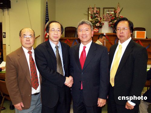 12月17日,美國洛杉磯華埠中華會館已有114年歷史,選出的2008年新一屆主席伍競群和副主席黃新周,在接受現(xiàn)任主席張自豪的祝賀。中新社發(fā) 盧威 攝