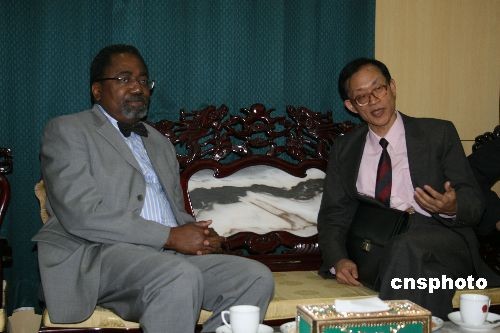 當(dāng)?shù)貢r(shí)間24日下午,聯(lián)合國(guó)-非盟達(dá)爾富爾維和行動(dòng)聯(lián)合特別代表阿達(dá)達(dá)(左)在中國(guó)駐蘇丹使館,會(huì)見到訪蘇丹的中國(guó)政府達(dá)爾富爾問(wèn)題特別代表劉貴今。中新社發(fā) 李鵬 攝
