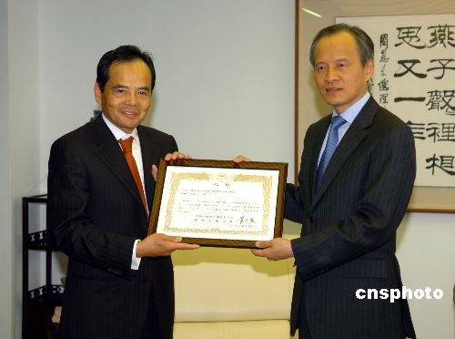 3月6日下午,日本零售業(yè)巨頭之一永旺集團董事長兼總經(jīng)理岡田元也來到中國駐日大使館,委托使館向中國臥龍熊貓基地捐款2500萬日元。圖為接受捐款后,中國駐日大使崔天凱(右)向岡田元也(左)頒發(fā)獎狀。中新社發(fā) 滕劍峰 攝