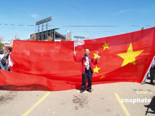 圖:巨幅五星紅旗歡迎北京奧運(yùn)圣火傳遞