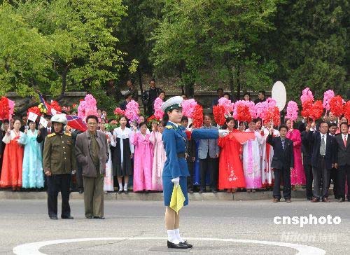 4月28日上午10時(shí)許,北京奧運(yùn)圣火在朝鮮首都平壤開(kāi)始傳遞。北京奧運(yùn)圣火在平壤的傳遞,從主題思想塔出發(fā),途徑中朝友誼塔、千里馬雕像、凱旋門(mén)等主要景點(diǎn),最終在金日成體育場(chǎng)舉行慶典儀式。圖為平壤女交警在傳遞路線上指揮交通。 中新社發(fā) 沈晨 攝