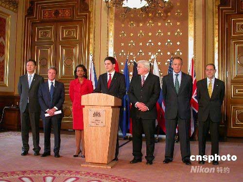 當(dāng)?shù)貢r間2日下午,伊朗核問題六國外長會議在倫敦舉行,就伊核問題復(fù)談方案達(dá)成一致,決定盡快向伊朗送交。中國外交部部長助理何亞非作為楊潔篪外長代表出席會議。圖從左至右分別為:何亞非、法國外長庫什內(nèi)、美國國務(wù)卿賴斯、英國外交大臣米利班德、德國外長施泰因邁爾、俄羅斯外長拉夫羅夫、歐盟共同外交與安全政策高級代表索拉納。中新社發(fā) 攝