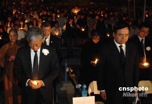 南加州悼念中國(guó)汶川地震遇難同胞燭光追思會(huì)當(dāng)?shù)貢r(shí)間五月二十一日晚在美國(guó)加州蒙特利公園市舉行。各界人士手捧蠟燭在夜色中默默祈禱,悼念中國(guó)汶川地震遇難同胞,愿逝者早日安息,生者更加堅(jiān)強(qiáng)。圖為中國(guó)駐洛杉磯總領(lǐng)事張?jiān)?前左)、南加州華人聯(lián)合總會(huì)會(huì)長(zhǎng)程遠(yuǎn)(前右)和大家一起為遇難同胞默哀。中新社發(fā) 張煒 攝