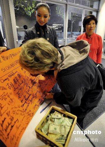當(dāng)?shù)貢r(shí)間五月二十二日晚間,第五屆舊金山國際藝術(shù)節(jié)在舊金山芳草地藝術(shù)中心開幕。原中央芭蕾舞首席演員侯宏瀾和美國舞者瓊斯擔(dān)綱的芭蕾舞劇《傾城之戀》作為首演節(jié)目登場(chǎng)。家在成都的侯宏瀾心系正在抗震救災(zāi)的家鄉(xiāng)父老,在劇場(chǎng)門口樹起一塊橙色紙板,用中英文寫著“請(qǐng)幫助中國四川受災(zāi)的人們”,F(xiàn)場(chǎng)觀眾競(jìng)相簽名捐款。中新社發(fā) 陳鋼 攝