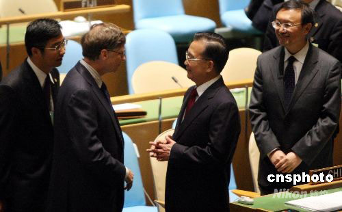25日,中國總理溫家寶出席聯(lián)合國千年發(fā)展目標高級別會議時與前微軟總裁比爾·蓋茨進行短暫交談。中新社發(fā) 李靜 攝