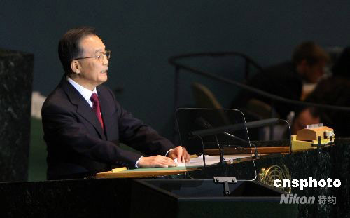 圖:溫家寶在千年發(fā)展目標(biāo)高級(jí)別會(huì)議上發(fā)表演講