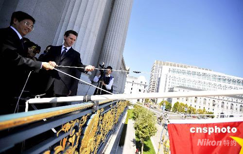 當?shù)貢r間九月二十九日中午,舊金山市長紐森(左二)和中國駐舊金山總領事高占生(左一),共同在市政府升起五星紅旗,慶祝中華人民共和國成立五十九周年。這是舊金山市第十三年為中國國慶升旗。同日,市長紐森宣布十月一日為“中國國慶日”和“華裔傳統(tǒng)日”。中新社發(fā) 陳鋼 攝