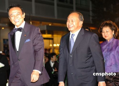 10月18日傍晚,第21屆東京國(guó)際電影節(jié)開幕。以“環(huán)!睘橹黝}的本屆電影節(jié)別出心裁地將星光大道的地毯由紅色改為綠色。上個(gè)月剛剛當(dāng)選日本首相的麻生太郎與開幕影片《赤壁》劇組成員同走綠地毯,成為第一個(gè)光臨東京國(guó)際電影節(jié)現(xiàn)場(chǎng)的日本總理大臣。中新社發(fā) 朱沿華 攝