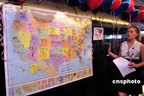 十一月五日,在香港的美國商會舉辦活動,讓居港的美國人士等候大選結(jié)果,現(xiàn)場亦公布麥凱恩及奧巴馬在各州得票的情況。中新社發(fā) 譚達(dá)明 攝