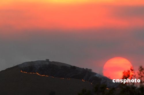 圖為太陽下山時(shí)科洛娜市的山火仍在蔓延。中新社發(fā) 張煒 攝