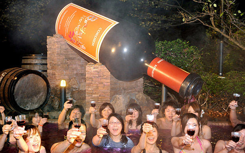 近日,一年一度的法國“博若萊”鮮葡萄酒開瓶日到來。由于時差原因,日本飲者得以先嘗為快,小涌園美酒溫泉浴活動也由此開始。在日本箱根的小涌園溫泉浴場,客人們泡在鮮葡萄酒溫泉中舉杯慶祝。