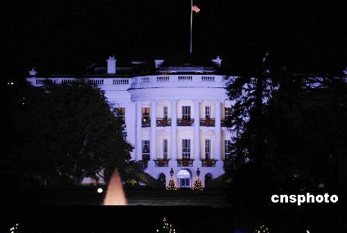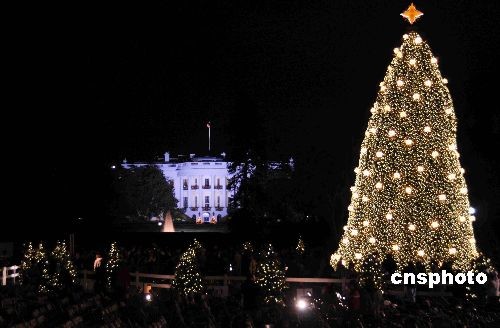 當(dāng)?shù)貢r(shí)間12月4日晚,美國(guó)華盛頓白宮南草坪萬(wàn)人聚集,美國(guó)總統(tǒng)布什和夫人勞拉出席2008年“國(guó)家圣誕樹(shù)”點(diǎn)亮儀式。白宮南草坪的“國(guó)家圣誕樹(shù)”點(diǎn)亮儀式最早開(kāi)始于1923年,白宮的主人都會(huì)在每年十二月第一周點(diǎn)亮這棵大型的圣誕樹(shù)和周圍栽種著象征美國(guó)五十個(gè)州小樹(shù)上的燈珠。圖為當(dāng)夜白宮在圣誕樹(shù)的映照下。中新社發(fā) 邱江波 攝