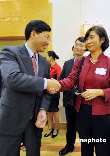 當(dāng)?shù)貢r間十二月五日,中國駐舊金山總領(lǐng)事高占生向美國加州大學(xué)戴維斯分校華裔教授潘忠禮(左)頒發(fā)賀狀,祝賀他獲得2007年度美國青年科學(xué)家總統(tǒng)獎。今年春天,潘忠禮教授曾獲得美國農(nóng)業(yè)部2007年度赫爾伯特-拉波爾特杰出中青年農(nóng)業(yè)研究科學(xué)家獎。中新社發(fā) 陳鋼 攝