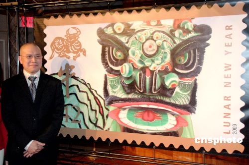 美國郵政總局8日正式發(fā)行“牛年”郵票,以慶祝世界約四分之一人口正期盼的農(nóng)歷新年“牛年”到來。圖為郵票設計者、現(xiàn)居紐約的華裔郵票藝術家麥錦鴻(Kam Mak)和“牛年”郵票。中新社發(fā) 魏晞 攝