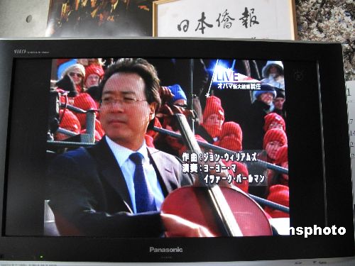 圖為日本電視臺實況轉播奧巴馬就職大典時馬友友演奏大提琴的鏡頭。美國華裔大提琴家馬友友,當?shù)貢r間1月20日中午在奧巴馬的就職大典上,與其它三位音樂家合演了《空氣與簡樸禮物》(Air and Simple Gifts),獻給新總統(tǒng)。據報道,馬友友曾應邀在五位美國總統(tǒng)面前獻藝,最早的一位是肯尼迪總統(tǒng),當時的馬友友年僅七歲,與胞姐一起在白宮演出。馬友友16日接受哥倫比亞廣播公司訪問時興奮地說,“簡直不敢相信,這是四十五年前的事了”。但這可能比不上1月20日為奧巴馬在就職典禮上的表演,讓他感到更光榮與驕傲。中新社發(fā) 段躍中 攝
