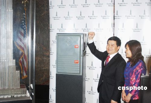 1月23日起,美國(guó)紐約著名的標(biāo)志性建筑帝國(guó)大廈,將連續(xù)4天在大廈頂端點(diǎn)亮象征中國(guó)的一千三百二十七盞紅黃兩色彩燈,以慶祝中國(guó)農(nóng)歷新年的到來。圖為中國(guó)駐紐約副總領(lǐng)事董曉軍及夫人出席了當(dāng)天的亮燈儀式,并共同拉下象征啟動(dòng)的電閘。中新社發(fā) 魏晞 攝