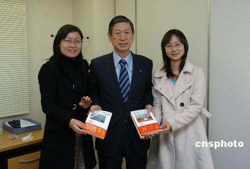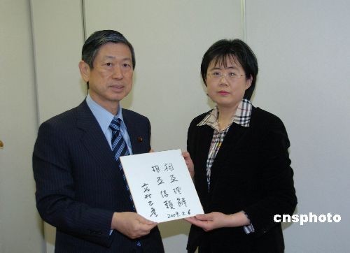 2月6日上午,日本前外相、日中友好議員聯(lián)盟會長、眾議院議員高村正彥,在東京接見了第四屆中國人日語征文大賽主辦單位日本僑報社代表和兩名最優(yōu)秀獎(日本大使獎)獲獎者——北京大學研究生徐蓓和湘潭大學青年教師張桐赫。高村正彥聽取了日本僑報社關于日中作文大賽的匯報,高度評價大賽為促進日中兩國人民的相互理解起了積極的作用。高村勉勵獲獎者和所有參賽者繼續(xù)努力,為日中交流作出更大貢獻。高村正彥當場揮毫,題寫了“相互理解 相互信賴”,表達對日中兩國青少年的期待。中新社發(fā) 段躍中 攝