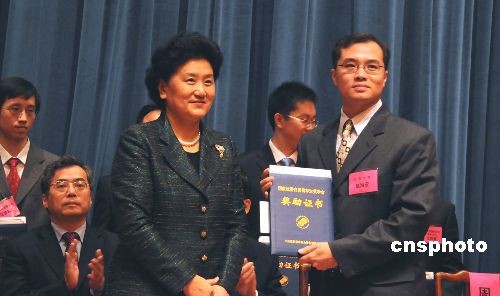 當(dāng)?shù)貢r(shí)間4月15日,應(yīng)美國(guó)政府邀請(qǐng)率代表團(tuán)正在美國(guó)訪問的中國(guó)國(guó)務(wù)委員劉延?xùn)|,在中國(guó)駐美使館為十幾名優(yōu)秀的中國(guó)留學(xué)生頒發(fā)了“二00八年度國(guó)家優(yōu)秀自費(fèi)留學(xué)生獎(jiǎng)學(xué)金”。圖為劉延?xùn)|為中國(guó)留美學(xué)生頒發(fā)獎(jiǎng)學(xué)金。中新社發(fā) 吳慶才 攝