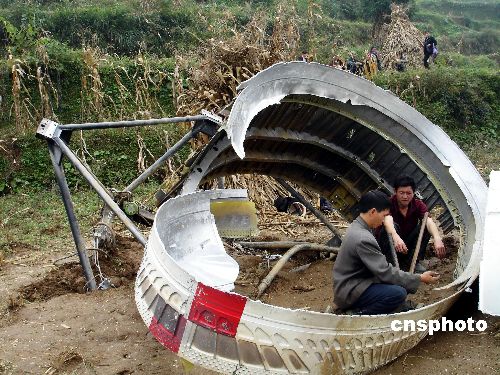 10月24日18時05分,在西昌衛(wèi)星發(fā)射中心發(fā)射的“嫦娥一號”衛(wèi)星,任務(wù)代號“07——34”,一級火箭殘骸成功著落于貴州福泉道坪鎮(zhèn)上平果村民組。殘骸 外殼著落于該村民組玉米地面,殘骸著落于一吳姓村民房屋中梁,全村民無人受傷。目前相關(guān)部門正在組織人員拆卸回收。中新社發(fā) 易勝武 攝