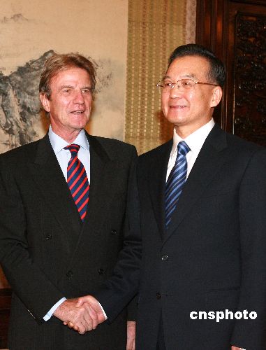 十月三十一日,中國(guó)國(guó)務(wù)院總理溫家寶在北京會(huì)見(jiàn)法國(guó)外交部部長(zhǎng)貝爾納·庫(kù)什內(nèi)。中新社發(fā) 廖文靜 攝