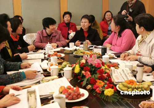 圖為婦聯(lián)政協(xié)委員們在一起審議政府工作報(bào)告。