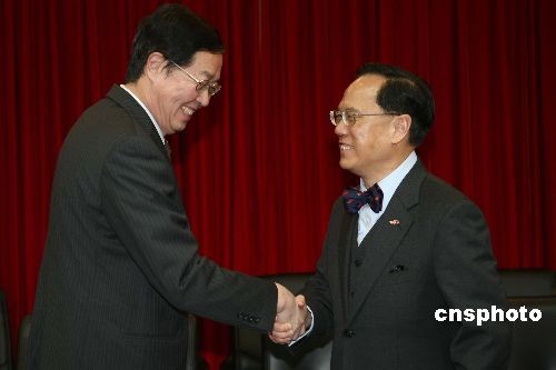 3月18日,香港特別行政區(qū)行政長(zhǎng)官曾蔭權(quán)在北京先后拜訪(fǎng)了中國(guó)人民銀行和中國(guó)證券監(jiān)督管理委員會(huì)。圖為曾蔭權(quán)與中國(guó)人民銀行行長(zhǎng)周小川握手。中新社發(fā) 盛佳鵬 攝