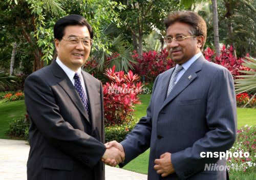 4月11日上午,中國國家主席胡錦濤在海南省三亞市下榻的飯店南草坪上舉行儀式,歡迎巴基斯坦總統(tǒng)穆沙拉夫訪華。穆沙拉夫還將出席博鰲亞洲論壇2008年年會開幕式。中新社發(fā) 任晨鳴 攝