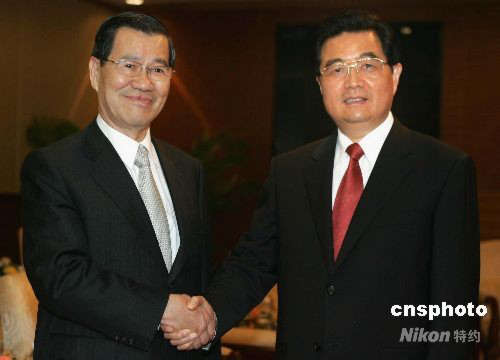 4月12日下午,中共中央總書記胡錦濤在海南省博鰲會(huì)見出席博鰲亞洲論壇2008年會(huì)的兩岸共同市場(chǎng)基金會(huì)董事長(zhǎng)蕭萬長(zhǎng)。中新社發(fā) 任晨鳴 攝