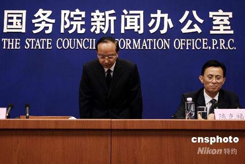 5月23日,在國(guó)務(wù)院新聞辦公室就四川汶川地震災(zāi)害和抗震救災(zāi)情況舉行的第十二次發(fā)布會(huì)上,四川省副省長(zhǎng)李成云鞠躬感謝全國(guó)人民的支持。中新社發(fā) 杜洋 攝