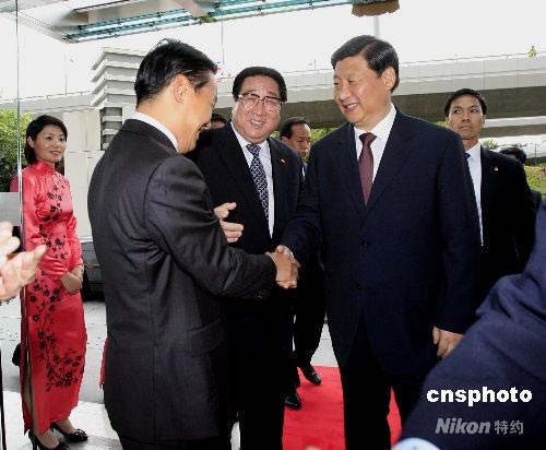 七月七日,中國國家副主席習(xí)近平(右)在中央駐港聯(lián)絡(luò)辦公室接見中央駐港機(jī)構(gòu)和中資機(jī)構(gòu)負(fù)責(zé)人,中聯(lián)辦主任高祀仁(中)及多位副主任到門口迎接。中新社發(fā) 王麗南 攝