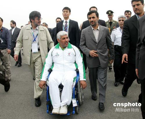 圖為伊朗將參加北京殘奧會(huì)的運(yùn)動(dòng)員Mirzaei Jaberi(左二)到機(jī)場(chǎng)迎接內(nèi)賈德總統(tǒng)。