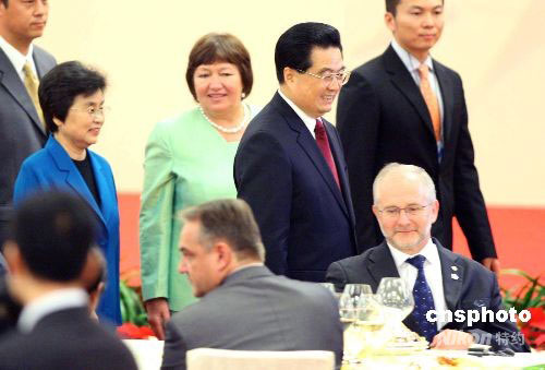 圖為胡錦濤夫婦與國(guó)際殘奧委會(huì)主席克雷文夫婦進(jìn)入宴會(huì)現(xiàn)場(chǎng)。
